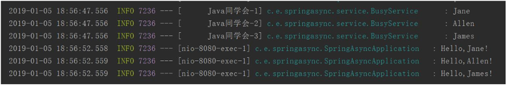 我们看到名字前缀为“Java同学会”前缀的3个线程,打印了busyMethod方法中的日志。因为busyMethod方法是我们定义的Executor线程池中的线程执行的。我们再看看test方法和busyMethod方法中日志打印的时间,它们相隔了5秒,说明test方法中的CompletableFuture.allOf(jane,allen,james).join()一直在等待,等待所有调用的异步方法都执行完,才继续执行。