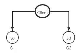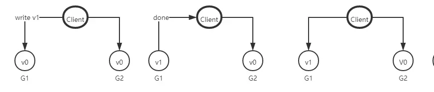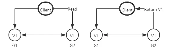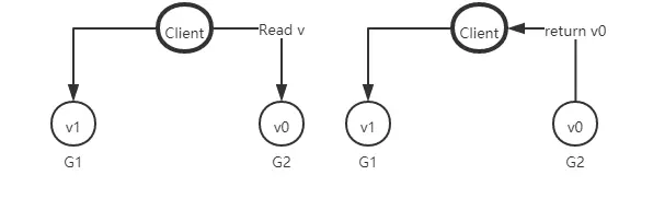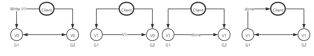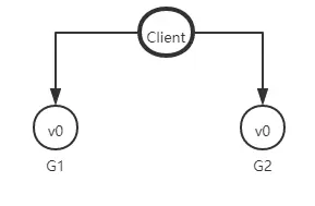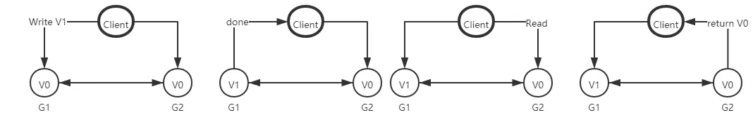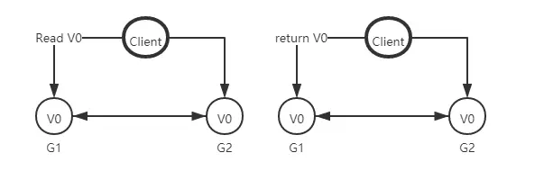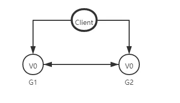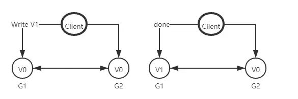 来思考一个简单的分布式系统,本系统由两个服务组成,G1和G2服务都提供保存了相同变量 V,他的初始值是V0,G1和G2可以相互通讯,并且可以和外部客户端通讯。下面就是我们系统的样子