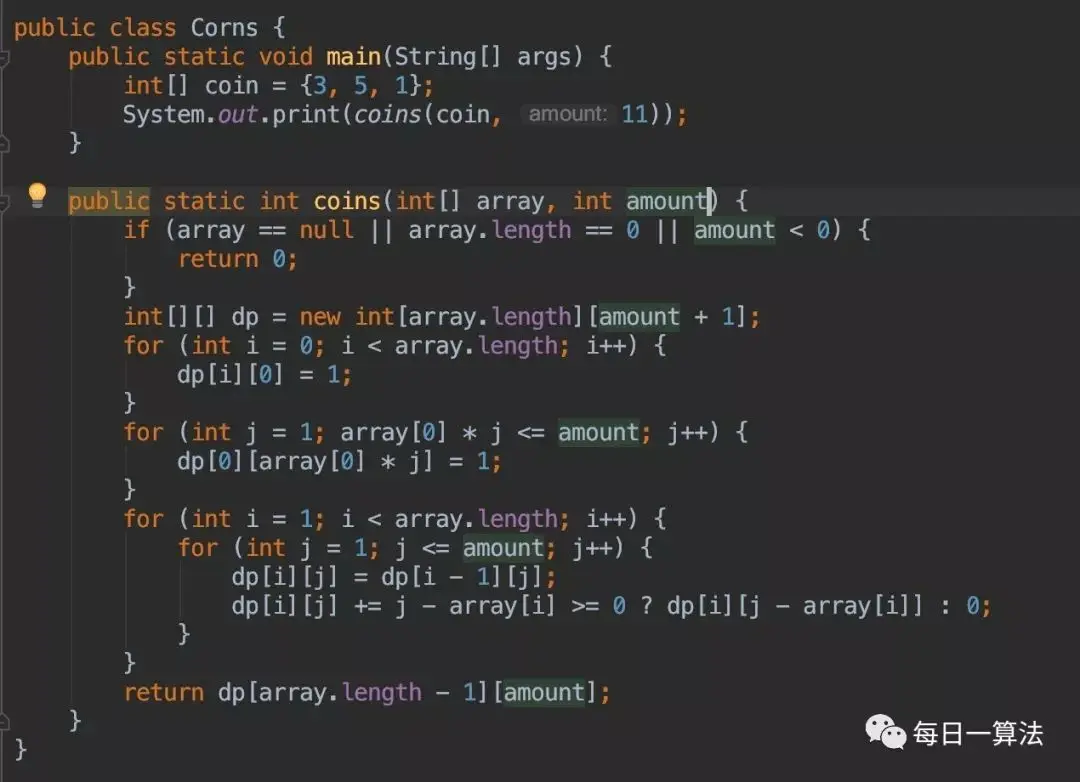 给定不同面额的硬币 coins ,每个值都代表一个面值的货币,每种面值都可以使用任意张,再给定一个总金额 amount,求换钱有多少种方法。