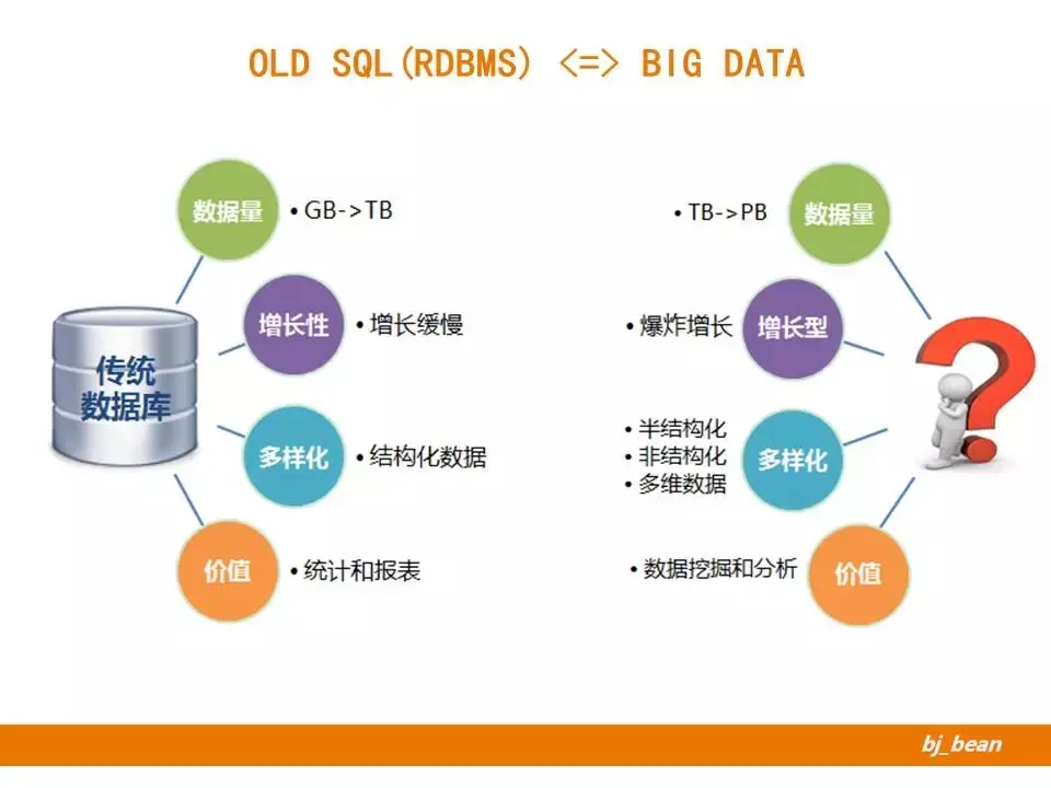 我们再来对比一下传统数据库与大数据技术。从数据量、增长型、多样化、价值等维度对比两种技术,各自有其适用场景。