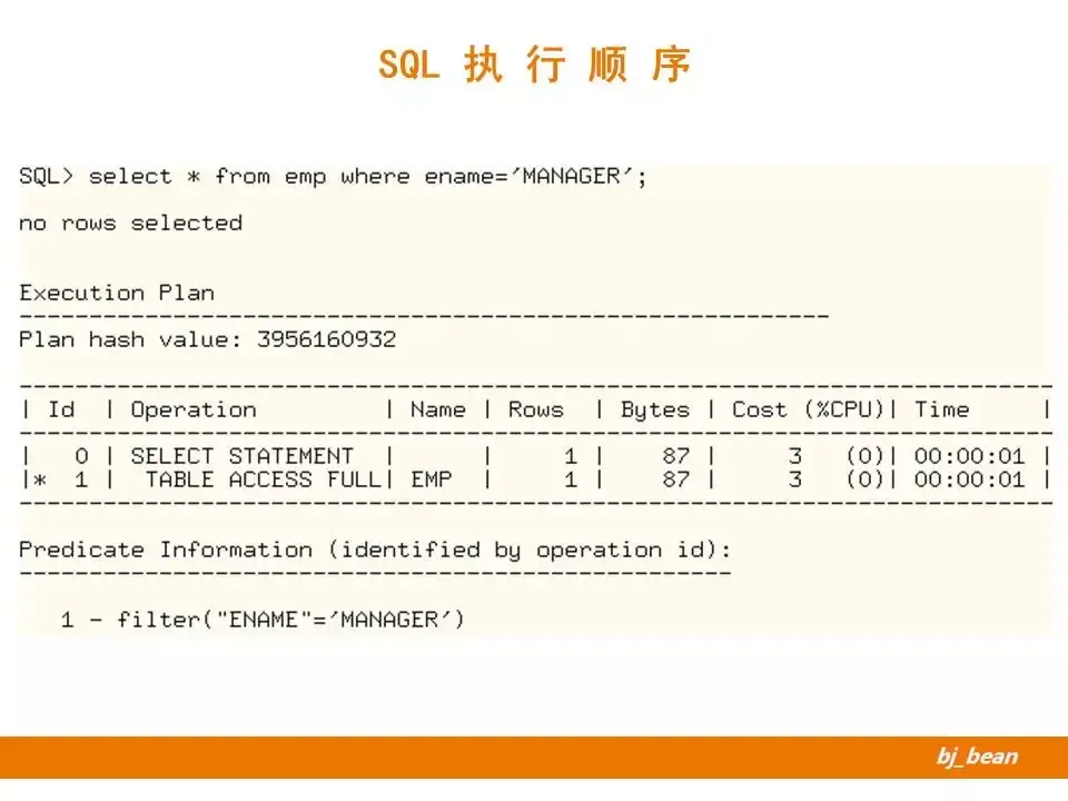 第一步,是按照全表扫描的方式访问了对象表(EMP)。对应于语句中的FROM部分。
