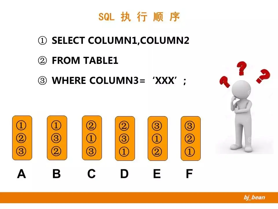 这是一个很简单的示例,是关于SQL语句执行顺序的。这里将一个普通的SELECT语句,拆分为三个子句。那么在实际的执行过程中,是按照什么顺序处理的呢?这里有A-F六个选项,大家可以思考选择一下…