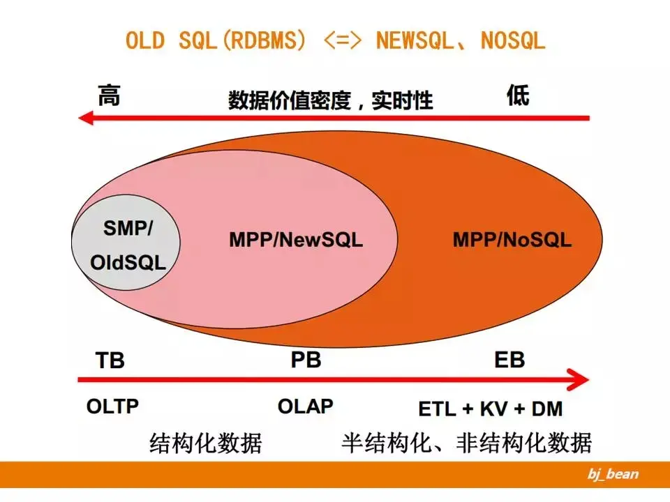让我们先来看一张经典的图。图中描述了传统SMP架构的关系型数据库、MPP架构的NEWSQL、MPP架构的NoSQL不同方案的适用场景对比。