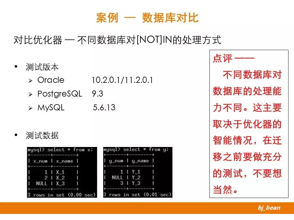第二种情况,是对于NOT IN子查询的处理。这种情况下,Oracle的不同版本、PG和MySQL表现出不同的行为。从上面例子可以看出,11g的优化器在处理此种情况是更加智能一些。