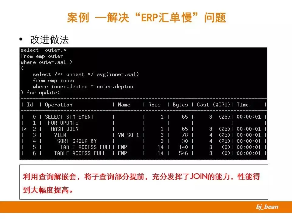 引入了一个Hint-unnest,主动实现子查询的解嵌套。将子查询部分提前,让优化器有了更多的选择。从执行计划来看,优化器生成了一个内联视图,然后跟外部表实现了一个哈希连接,整体效率大大提高。