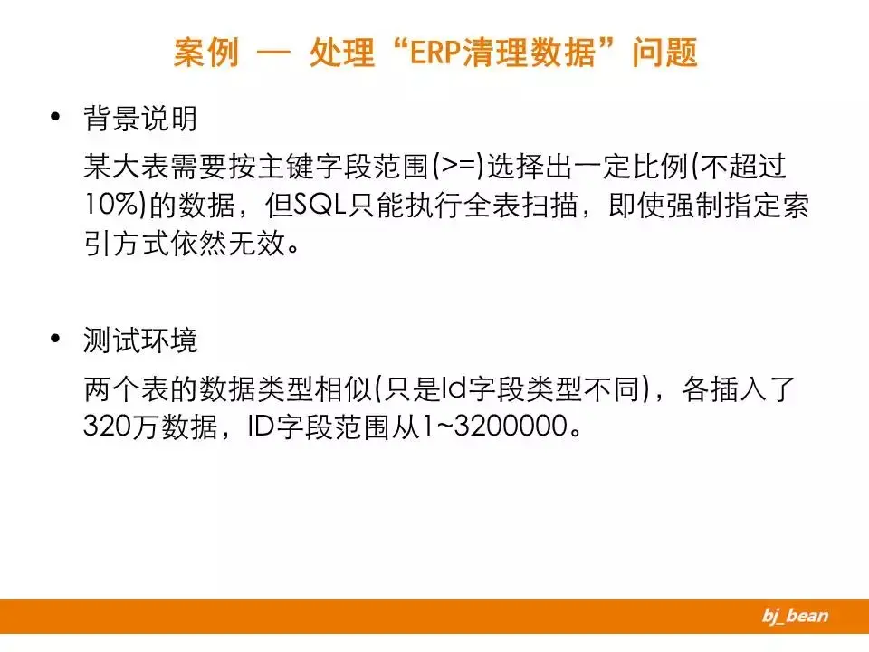 这是某公司后台的ERP系统,系统已经上线运行了10多年。随着时间的推移,累积的数据量越来越大。公司计划针对部分大表进行数据清理。在DBA对某个大表进行清理中,出现了问题。这个表本身有数百G,按照指定的清理规则只需要根据主键字段范围(>=)选择出一定比例(不超过10%)的数据进行清理即可。但在实际使用中发现,该SQL的是全表扫描,执行时间大大超出预期时间。DBA尝试使用强制指定索引方式清理数据,依然无效。