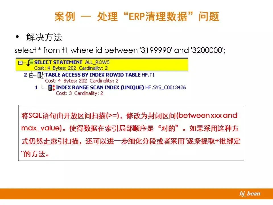 知道了问题所在,该如何处理呢?修改结构无疑成本太高,不具备可操作性。这里所采取的策略是“局部有序”。利用修改语句中条件的范围,由开放区间变为封闭区间,影响基数的选择。(关于这部分,大家有兴趣可多看看《基于成本的Oracle优化》一书)