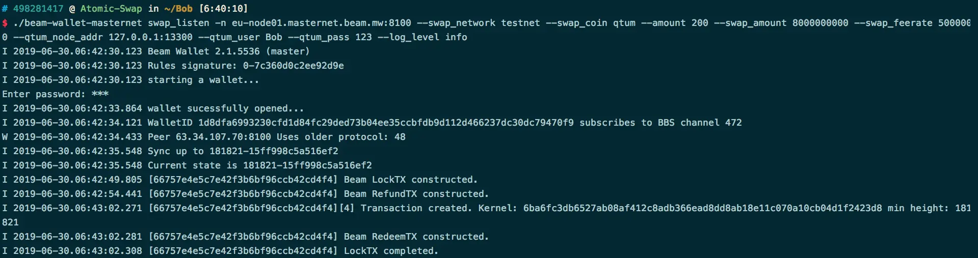 ./beam-wallet-masternet swap_listen -n eu-node01.masternet.beam.mw:8100 --swap_netword testnet –swap_coin qtum --amount 8000000000 --swap_feerate 5000000 --qtum_node_addr 127.0.0.1:13300 --qtum_user Bob --qtum_pass 123 --log_level info