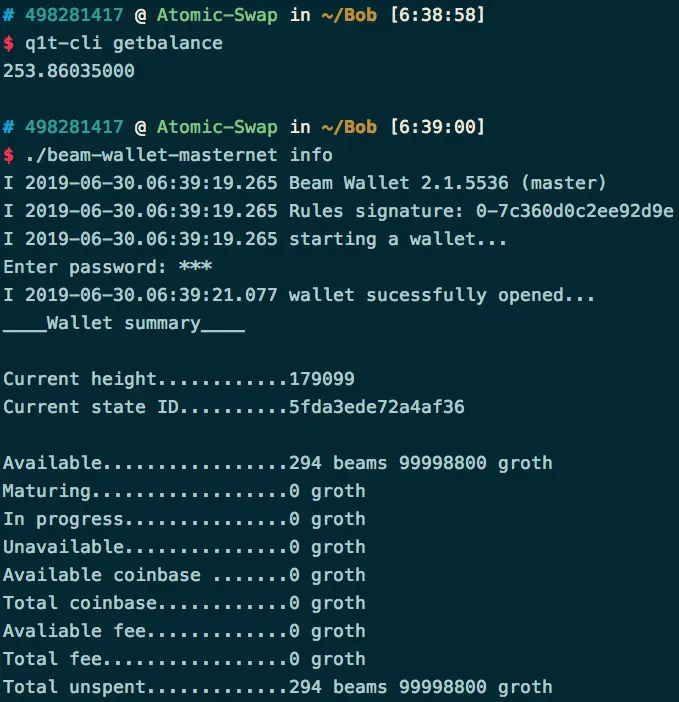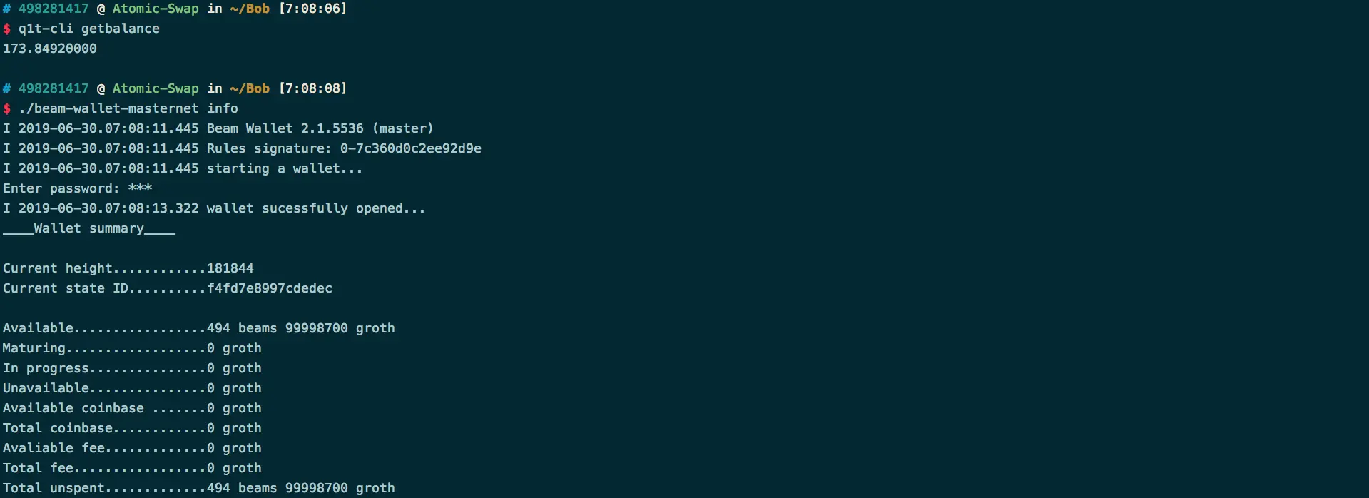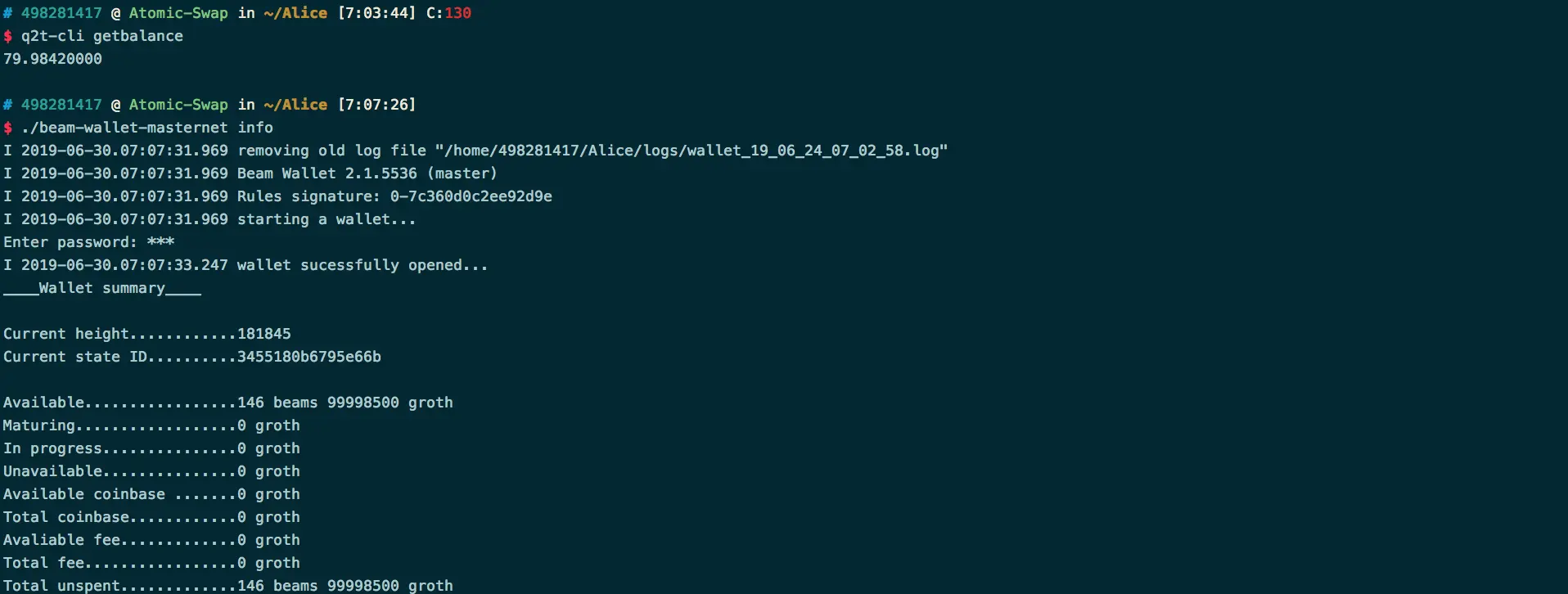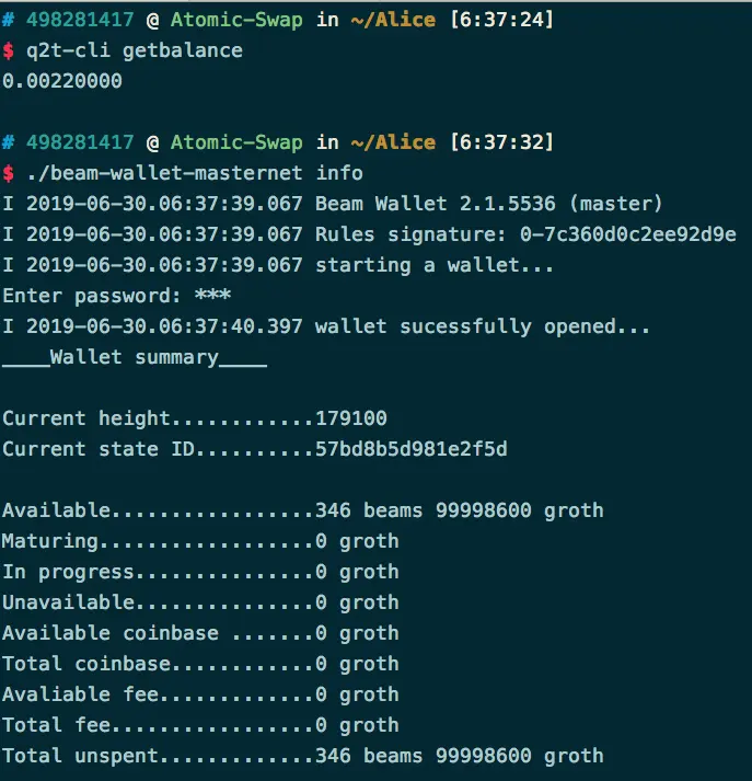 可见,Alice拥有约347个BEAM和0.0022个QTUM。Bob拥有约295个BEAM和254个QTUM。