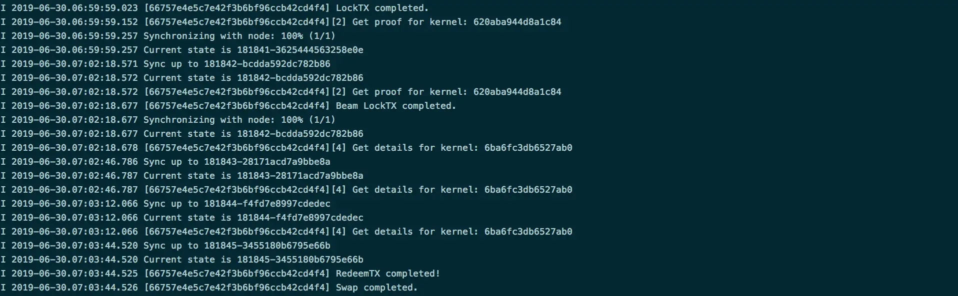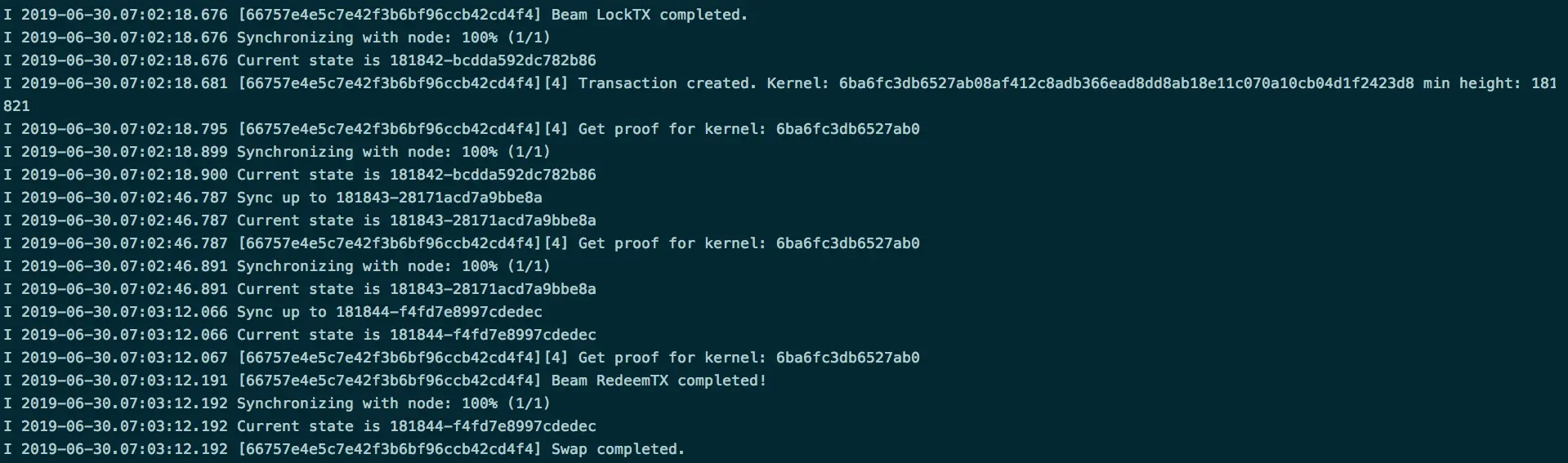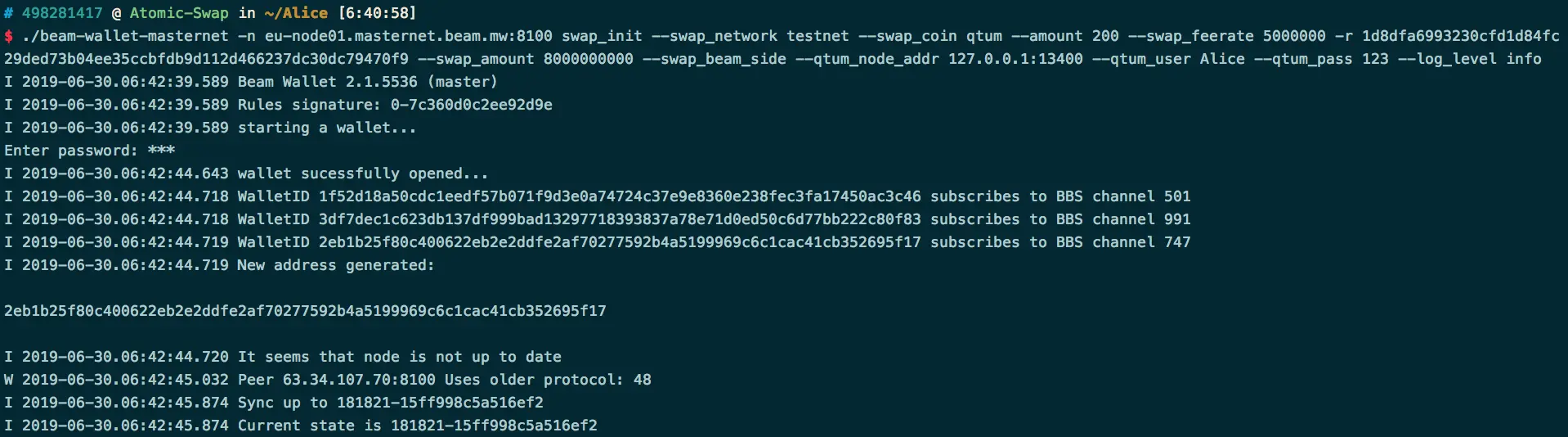 命令,通过指定BEAM接受方的地址来初始化一笔原子交易。Alice节点首先也会开始同步区块数据,当完成之后会按照上述交易流程的顺序开展和Bob的原子交换。