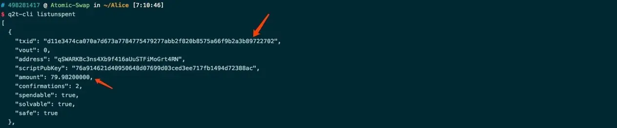 8、 在Qtum的测试网络浏览器上,可以看到关于QTUM原子交换的交易记录通过命令q2t-cli listunspent查询Alice拥有的UTXO的详细信息,得到一笔金额(amount)为80的UTXO的交易id是: