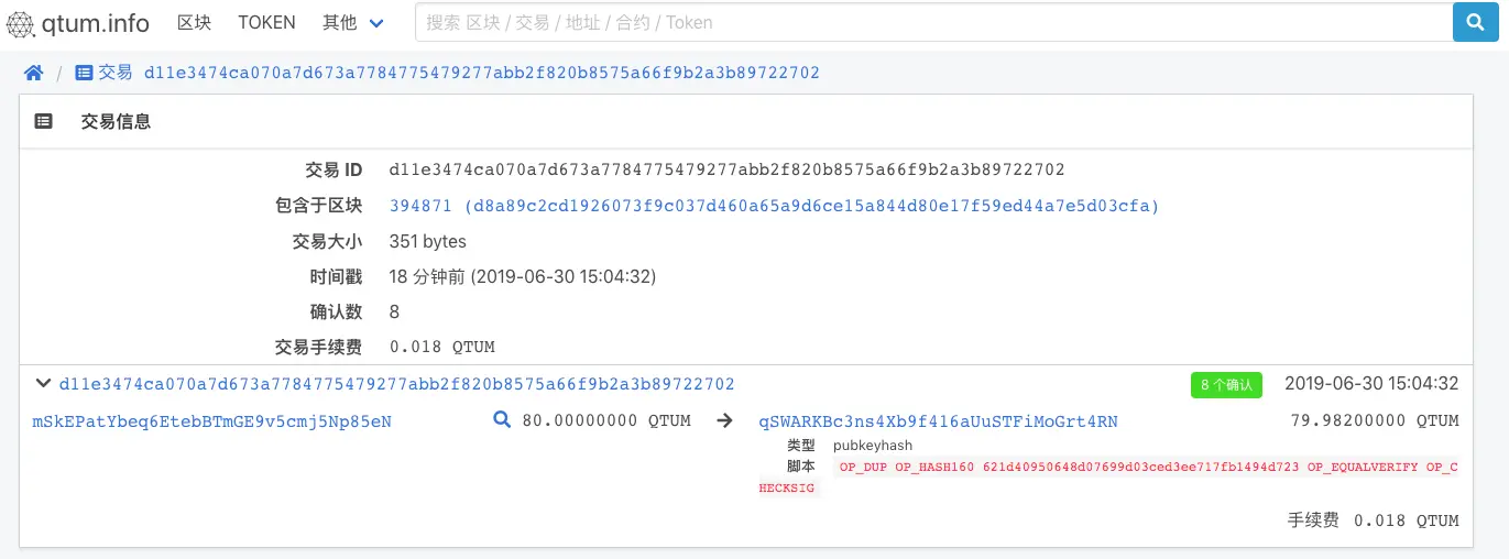 在Qtum区块链浏览器(https://testnet.qtum.info/tx/d11e3474ca070a7d673a7784775479277abb2f820b8575a66f9b2a3b89722702)进行查询,可以看到这笔通过原子交换生成的交易确实已经写入区块链中。