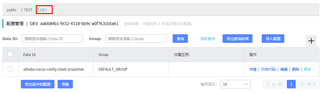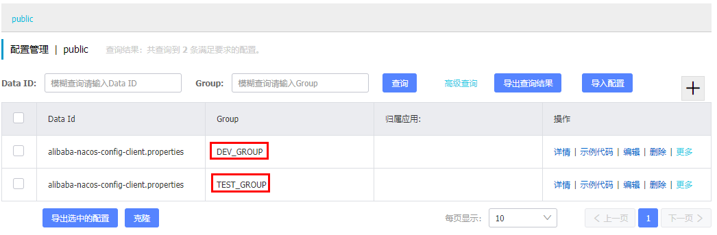 alibaba-nacos-config-client应用,定义了DEV环境和TEST环境的两个独立配置,这两个匹配与上一个方式不同,他们的 Data ID 是完全相同的,只是 Group不同。