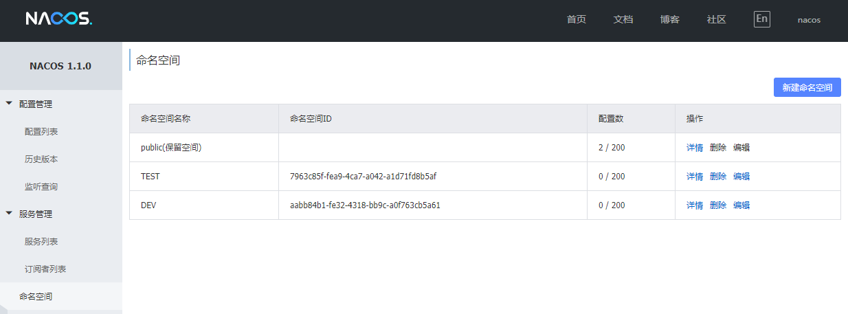 第一步: 先在Nacos中,在 服务管理 - 命名空间 根据环境名称来创建多个 Namespace :
