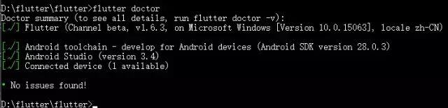 打印了一堆东西,打入各种 y 允许一下,so,这个问题搞定了。接下来嘛,就是第一个问题了,说 Flutter 需要 Android SDK 版本为 28,而且 Android BuildTools 为 28.0.3,我这里是 28.0.1,让我自行去检查升级下,其实这里提示说我这 SDK 在 C 盘,让我去那检查,也不知道这是不是缓存的,实际上我的 AS 配置的 SDK 在 D:\sdk 下,那里也存在 28.0.3,它为啥没检测到,不管了,从 D:\sdk 里面将需要的版本拷贝一下,粘贴到这里说的目录下,继续输入 flutter doctor,终于,都是绿绿的 √ 了,开森。