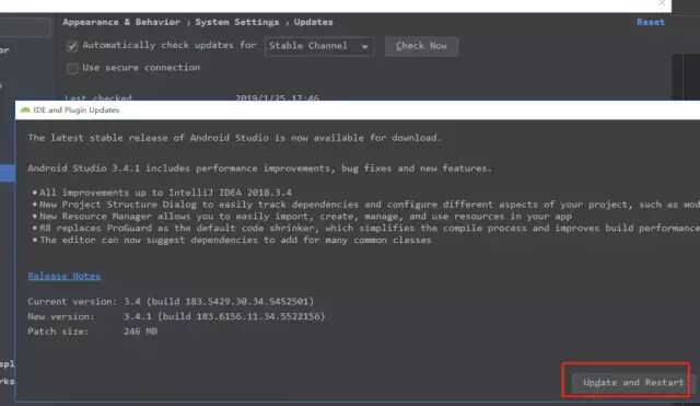 解答:点击 File -> Settings -> Appearance&Behavior -> System Settings -> Updates 将 Use secure connection 选项的 √ 去掉! 可是我发现我这里本来就是去掉的,只不过没勾上 Automatically check updates for Stable Channel ,于是勾上点击 Check Now,出现更新,点击 Update and Restart 顺带的更新重启一下。