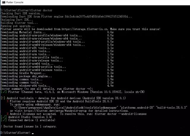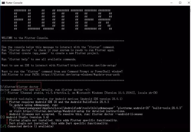 还是没跑起来!这里坑又来了,上面没理的 X 来报复了,再次打开 flutter_console.bat ,输入 flutter doctor,检测一下,果然,这里还有两个 X 没解决呢。