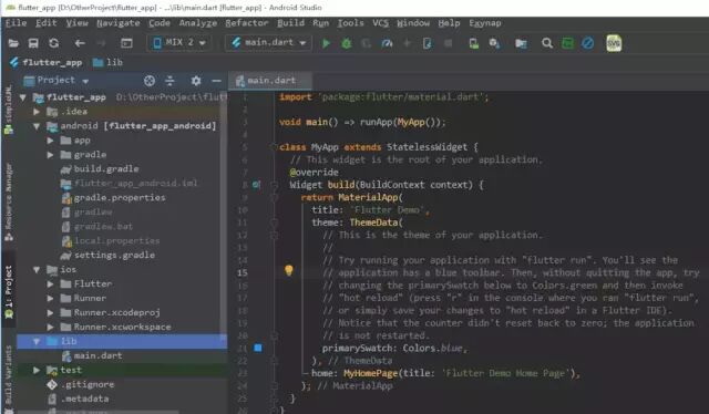 项目创建完毕,如图所示了,虽然没学过 dart 语言,先跑一下 。