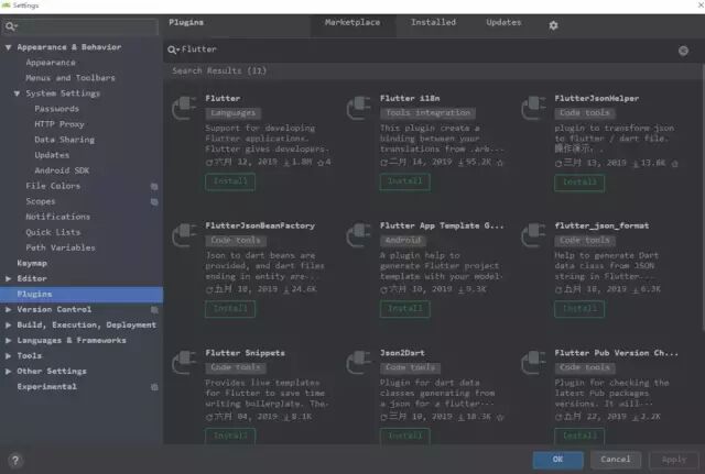 重启后,Automatically check updates for Stable Channel 还没勾上,勾上 Apply 一下,再到 Plugins 的 Marketplace 中搜索 Flutter,出现了。Install 后 Restart(虽然也不知道是不是上面设置的原因,总之暂时解决了插件搜不到问题就是好的,感觉也可能是没更新的原因,哈哈)