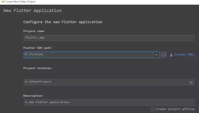随意取个 project 的名称,这里,第一个坑来了,Flutter SDK path,这里在开头明明就下载好了,解压在 D 盘的 flutter 文件夹下,可是总是检测失败。