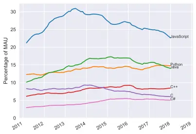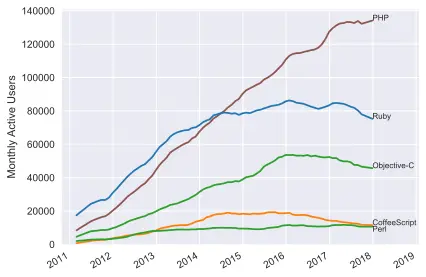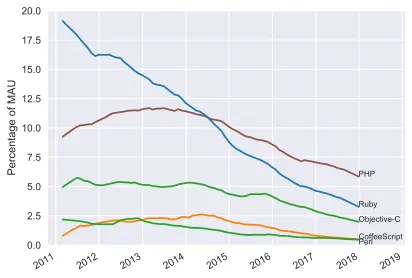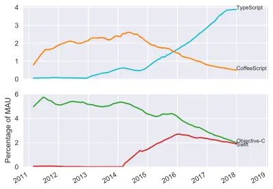 The second thing to note is that certain newer languages seem to be cannibalizing user share from older languages. For instance, the decline in Objective-C usage corresponds with the rise of Swift. Also, CoffeeScript seems to have been mostly supplanted by TypeScript: