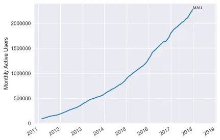 The cool thing about this is that there are usernames associated with each of those events, which means that I can count how many different people are using each language. Every time a user interacts with a repository I'm counting that user as using the language of that repository - and then aggregating this each month to calculate how many Monthly Active Users (MAU) each language has.