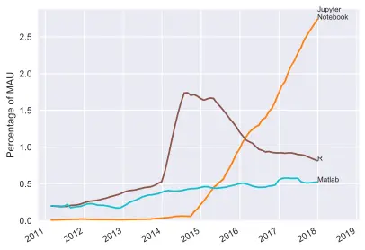 Juptyer Notebooks have seen significant and steady growth in the last couple of years. However, this seems to be mostly because of the growth of Python for doing data science. While Jupyter supports many other languages than just Python, in every case I've looked at the Jupyter Notebook was written in Python. This means that the popularity of Python is potentially undercounted in this analysis.