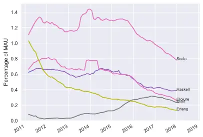 Finally, I thought it would be interesting to take a look at how functional languages are doing on GitHub.