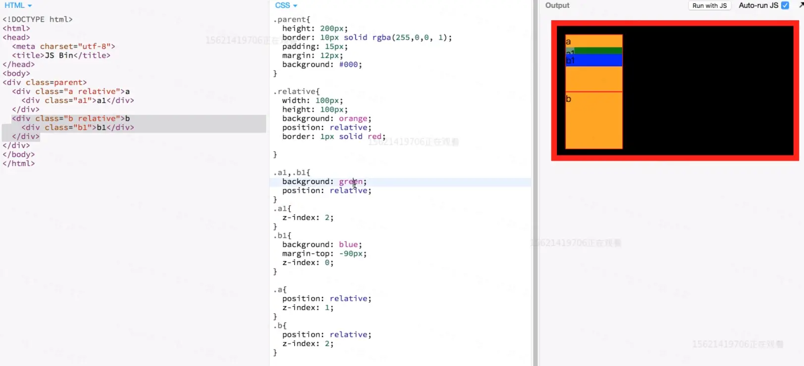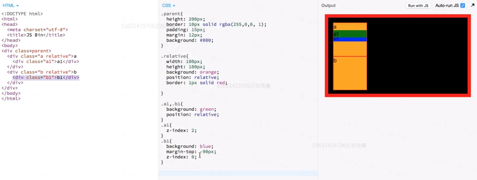 如果父div是定位的,并且z-index不是autu,那么z-index(-1)>border>background,因为一旦通过relative/absolute触发了父div,那么就是成立了一个新的部门,这时候大家就不是零散的了,这时候在一个部门里面了,负z-index就不能躲到后面去了
