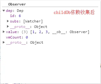 在访问到数组时,由于childOb的存在,会执行childOb.dep.depend();进行依赖收集,该Observer实例的dep属性会收集当前的watcher作为依赖保存,dependArray保证了如果数组元素是数组或者对象,需要递归去为内部的元素收集相关的依赖。
