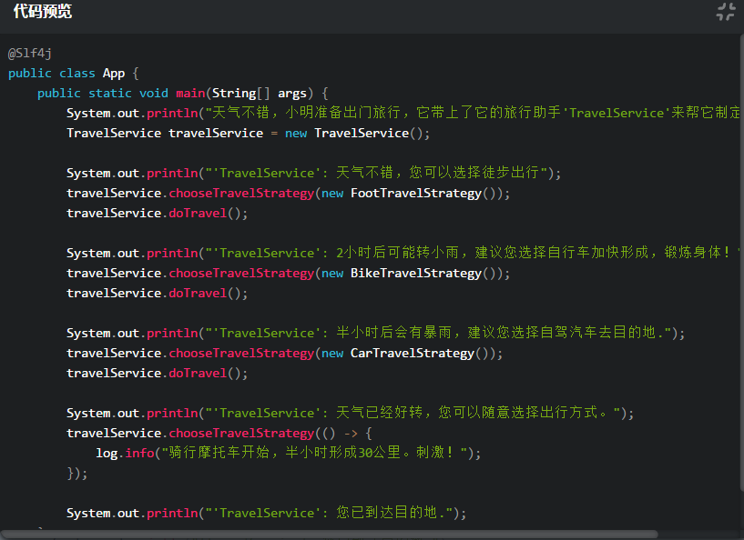 注意上面的关键代码为TravelService根据不同的天气选择了不同的出行策略。