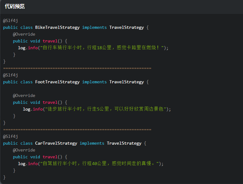 接着实现不同的出行算法,此处有BikeTravelStrategy, FootTravelStrategy, CarTravelStrategy。