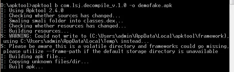 apktool b com.lsj.decompile_v.1.0 -o demofake.apk,执行过程如下图: