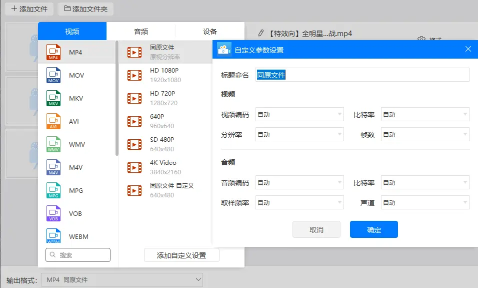 2、点击软件左下方的输出格式,然后选择mp4格式以及1080P的视频分辨率,不过最好选择原视频的分辨率,不然转换出来的视频会变模糊。也可以在转换之前选择输出视频的其他参数,例如:视频的比特率和帧数,音频的取样频率等。