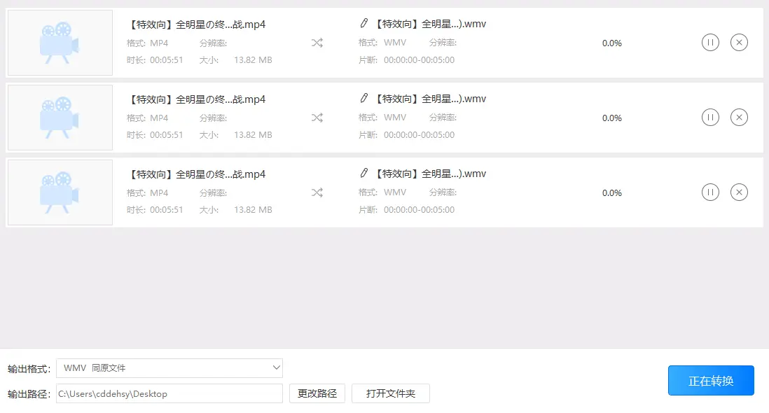 4、然后点击软件下面的开始转换,然后等待软件将wmv格式的视频转换成mp4格式,当软件转换到100%那就说明转换成功了。点击软件中的打开按钮可以直达mp4视频的保存目录并且打开播放。