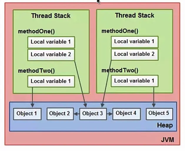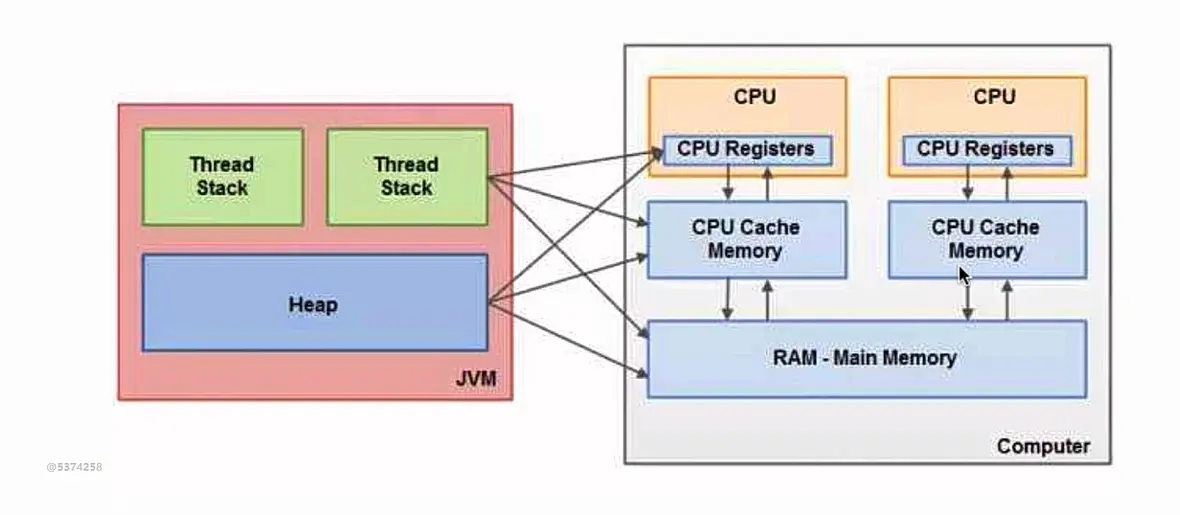 调用栈和本地变量存放在栈上,对象存放在堆上,如上图本地变量对对象的引用也是存放在线程栈上的。一个对象的成员变量可能会随着对象自身存放在堆上,静态成员变量跟随类的定义一起存放在堆上,存放在堆上的对象可以被持有这个对象引用的线程访问,当一个线程可以访问一个对象的时候也可以访问这个对象的成员变量。