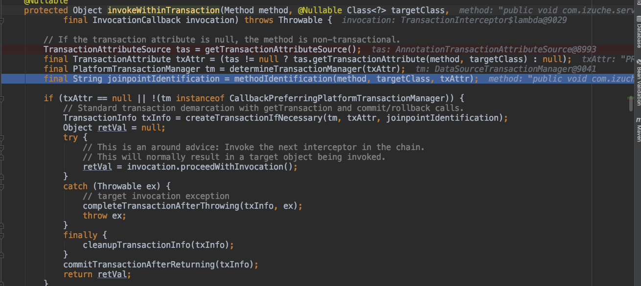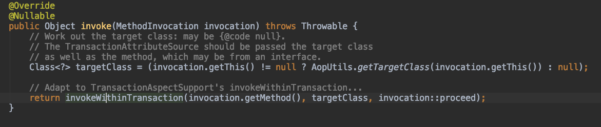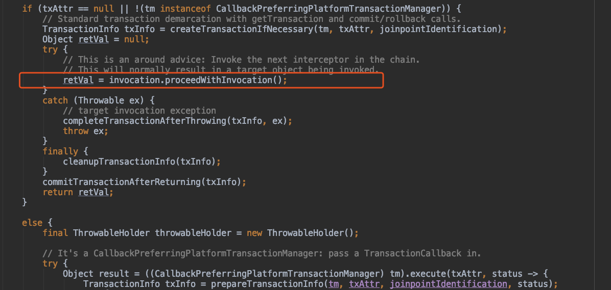声明式事务主要是通过Spring AOP实现的,对使用@Transactional注解的方法进行拦截,AOP通过代理方式执行目标方法,