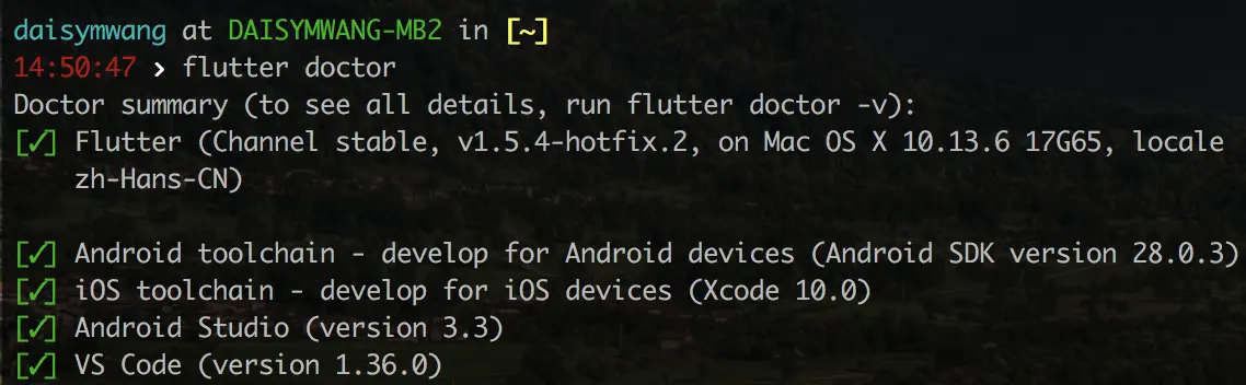 - 运行 flutter doctor ,检查环境,按照提示安装缺少的包,直到运行flutter doctor 无错误提示。