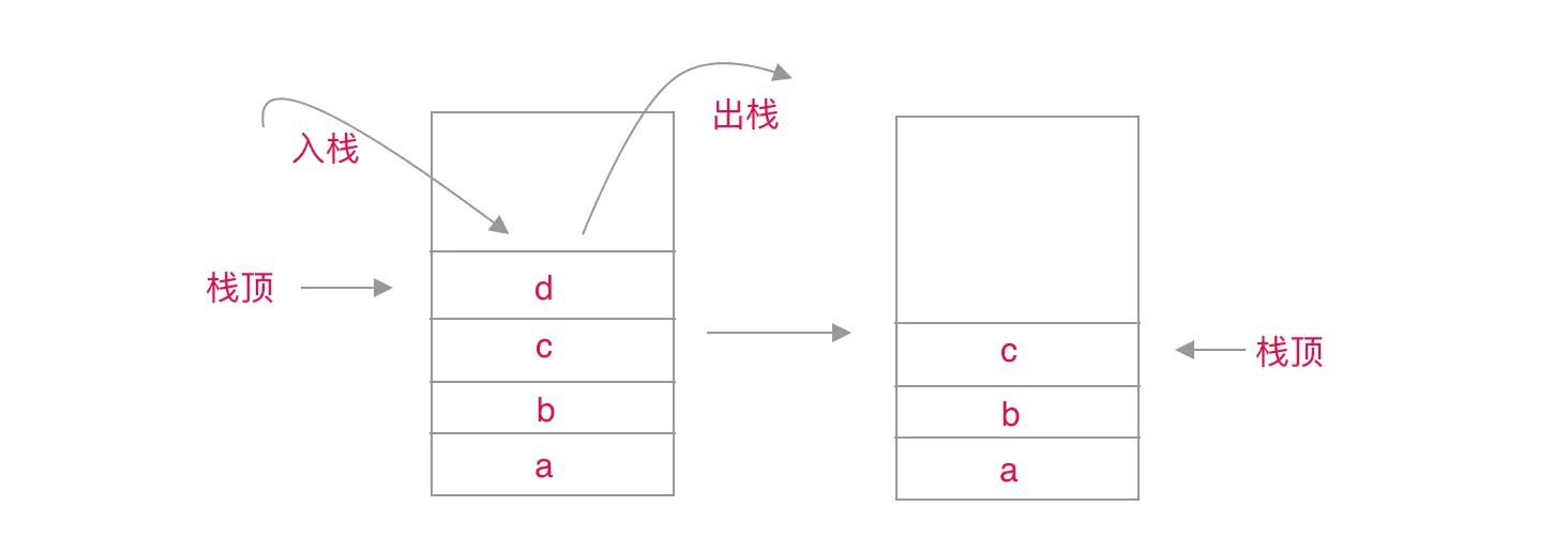 函数调用栈,就是用的这种结构,在一个函数 A 中调用另外一个函数 B,就会先把函数 B 压入到执行栈里,当函数 B 执行完毕之后,就会把函数 B 出栈,继续执行栈顶函数 A。特别是对于递归调用,我们要控制终止条件,不然就会出现递归次数过多,抛出maximum-call-stack-size-exceeded-error 的错误。解决办法可以将递归转化为迭代,或者使用尾递归优化。