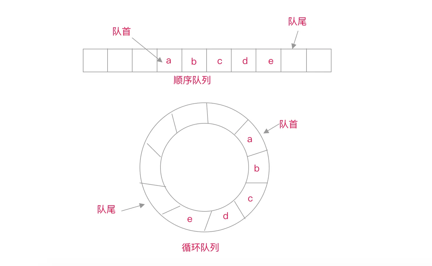 队列是一种抽象的 FIFO(first in, first out)数据结构。同理,队列也可以用数组或者链表实现。实际应用中,顺序队列使用比较多。队列一般暴露出来的操作,只有入队列和出队列,可能还有清空队列,查找等其他辅助操作。它遵循先进,先出的策略,后加入的元素放在队尾,类似于我们生活中排队买票一样。