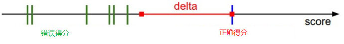 - 上面这幅图delta左边的红点是一个安全警戒线,什么意思呢?也就是说预测错误得分超过这个安全警戒线就会得到一个惩罚权重,让这个预测错误值退回到安全警戒线以外,这样才能够保证预测正确的结果具有唯一性。