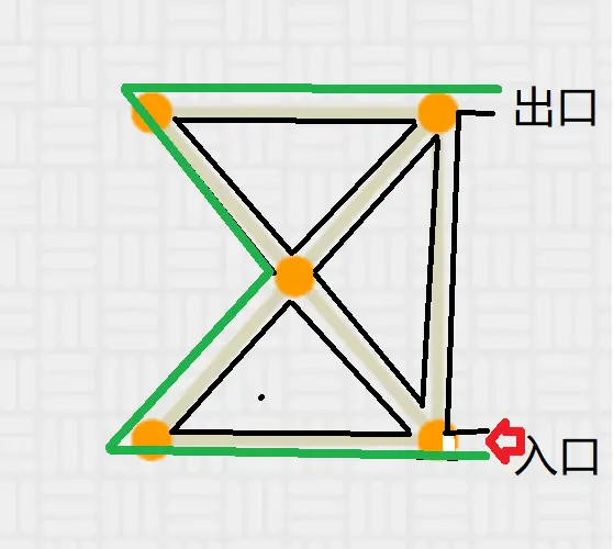 要想快速地走出去,办法就是,在入口处,手扶着墙,然后快速跑,自然而然就会找到出口。其原理就是在图形中找到一个一笔画,比如扶着下面绿色的墙: