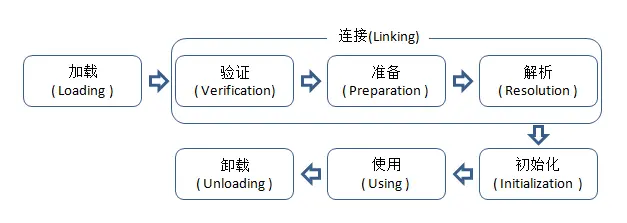 类从被加载到虚拟机内存中开始,到卸载出内存为止,它的整个生命周期包括:加载(Loading)、验证(Verification)、准备(Preparation)、解析(Resolution)、初始化(Initialization)、使用(Using)和卸载(Unloading)7个阶段。其中准备、验证、解析3个部分统称为连接(Linking)。如图所示