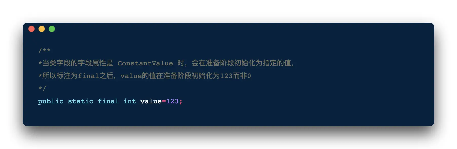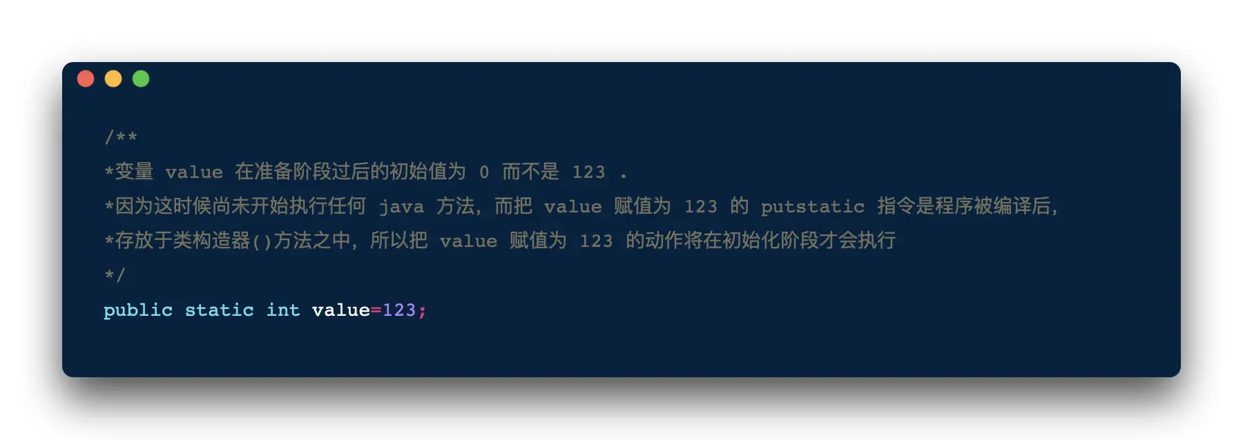 准备阶段是正式为类变量分配内存并设置类变量初始值的阶段,这些变量所使用的内存都将在方法区中进行分配。这时候进行内存分配的仅包括类变量(被static修饰的变量),而不包括实例变量,实例变量将会在对象实例化时随着对象一起分配在堆中。其次,这里所说的初始值通常情况下是数据类型的零值,假设一个类变量的定义为:
