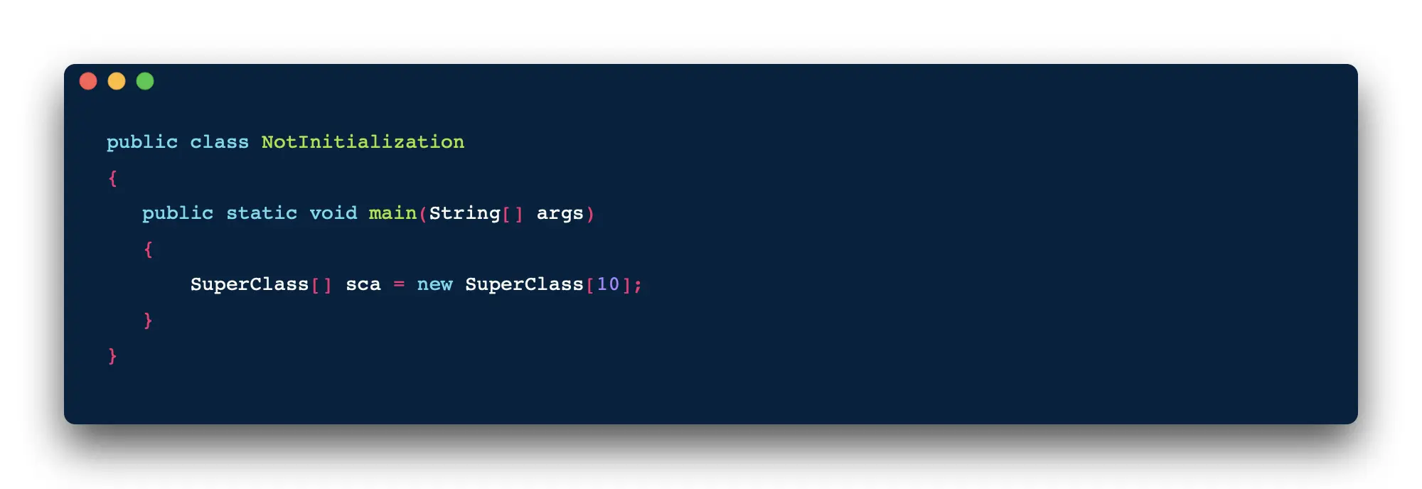 **验证 2: **通过数组定义来引用类,不会触发此类的初始化(我的理解是数组的父类是Object)
