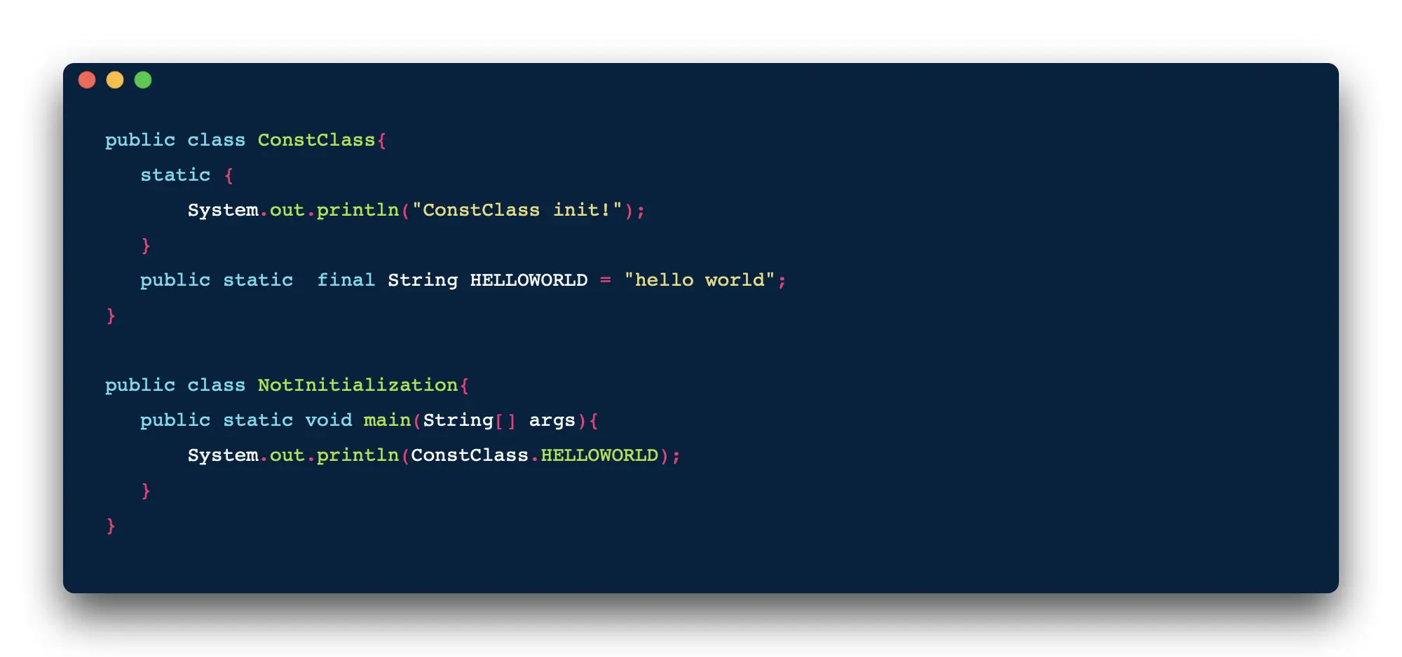 **验证 3: **常量在编译阶段会存入调用类的常量池中,本质上并没有直接引用到定义常量的类,因此不会触发定义常量的类的初始化