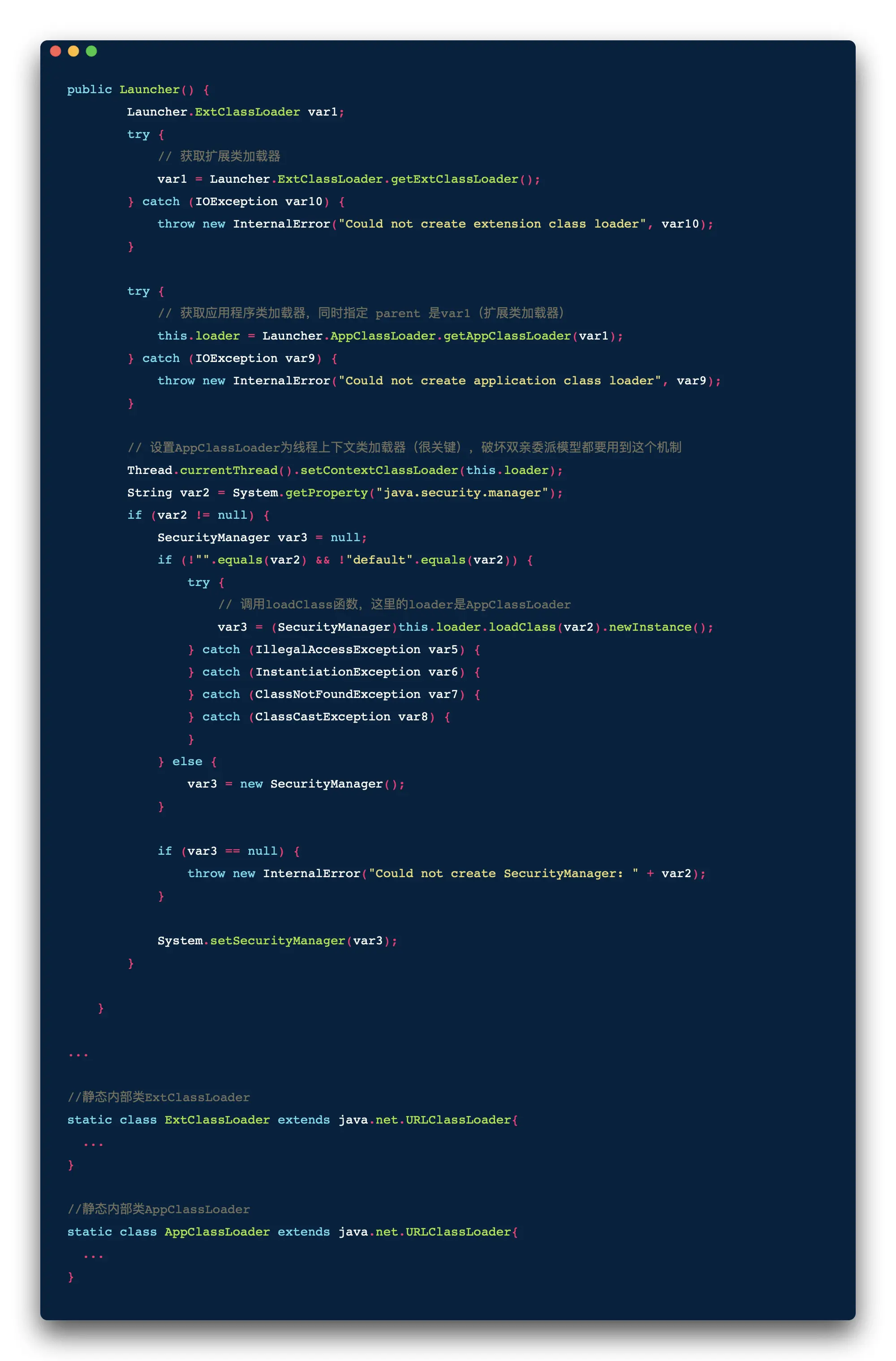 分析类加载器源码要从 sun.misc.Launcher.class 文件看起, 关键代码已添加注释,同时可以在此类中看到 ExtClassLoader 和 AppClassLoader 的定义,也验证了我们上文提到的他们不是继承关系,而是通过指定 parent 属性来形成的组合模型