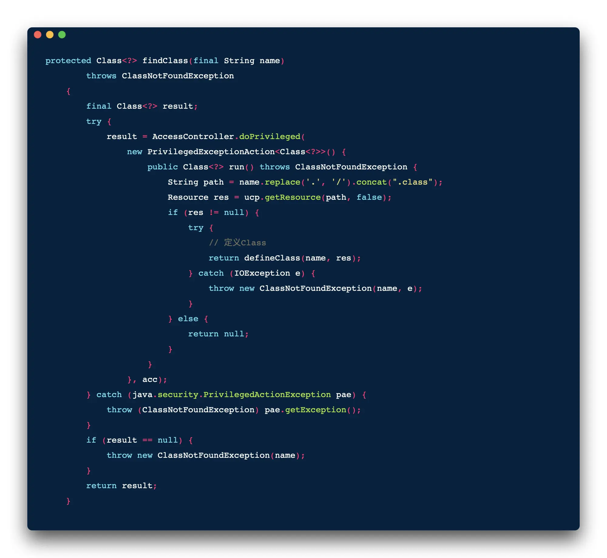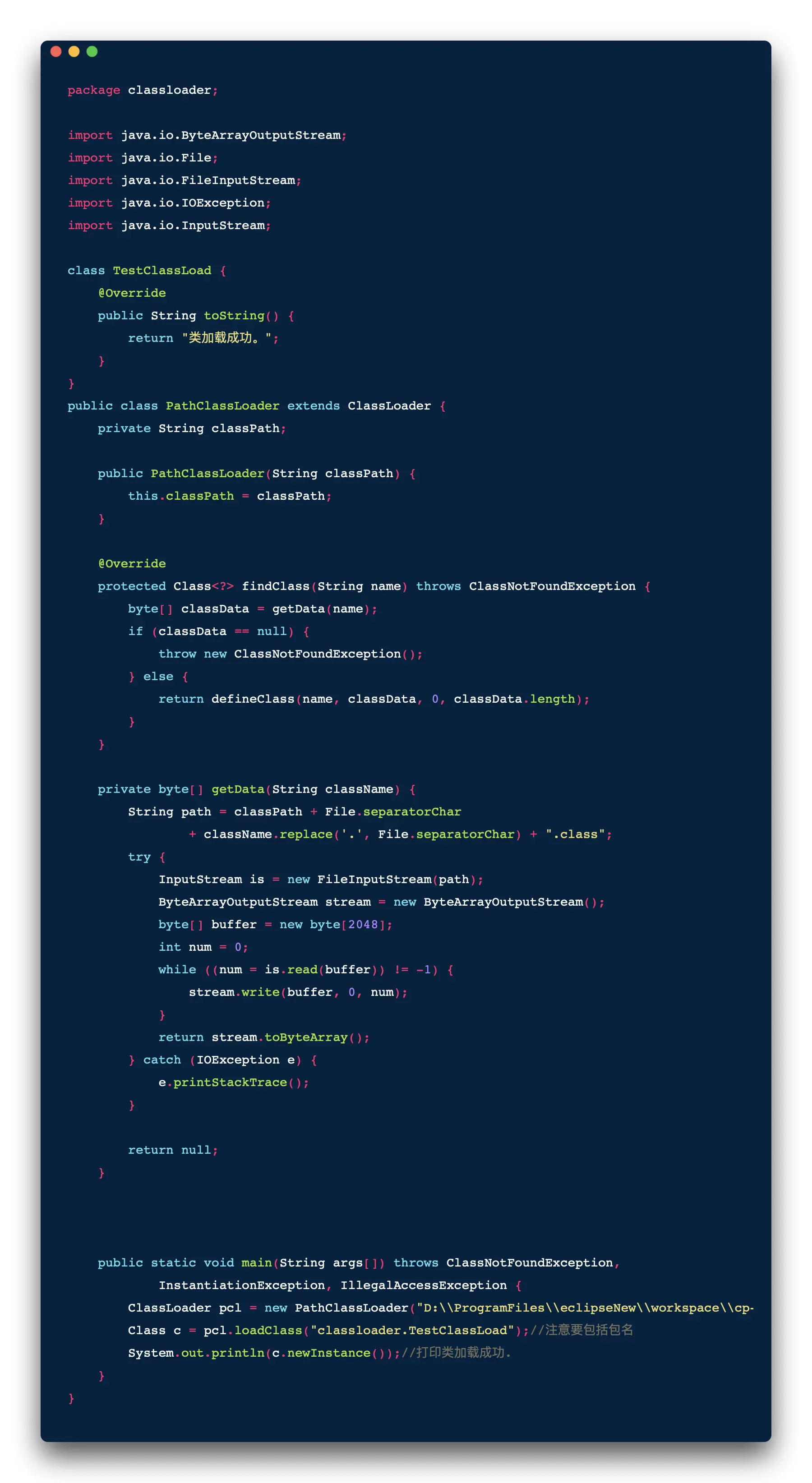 要创建用户自己的类加载器,只需要继承java.lang.ClassLoader类,然后覆盖它的findClass(String name)方法即可,即指明如何获取类的字节码流。