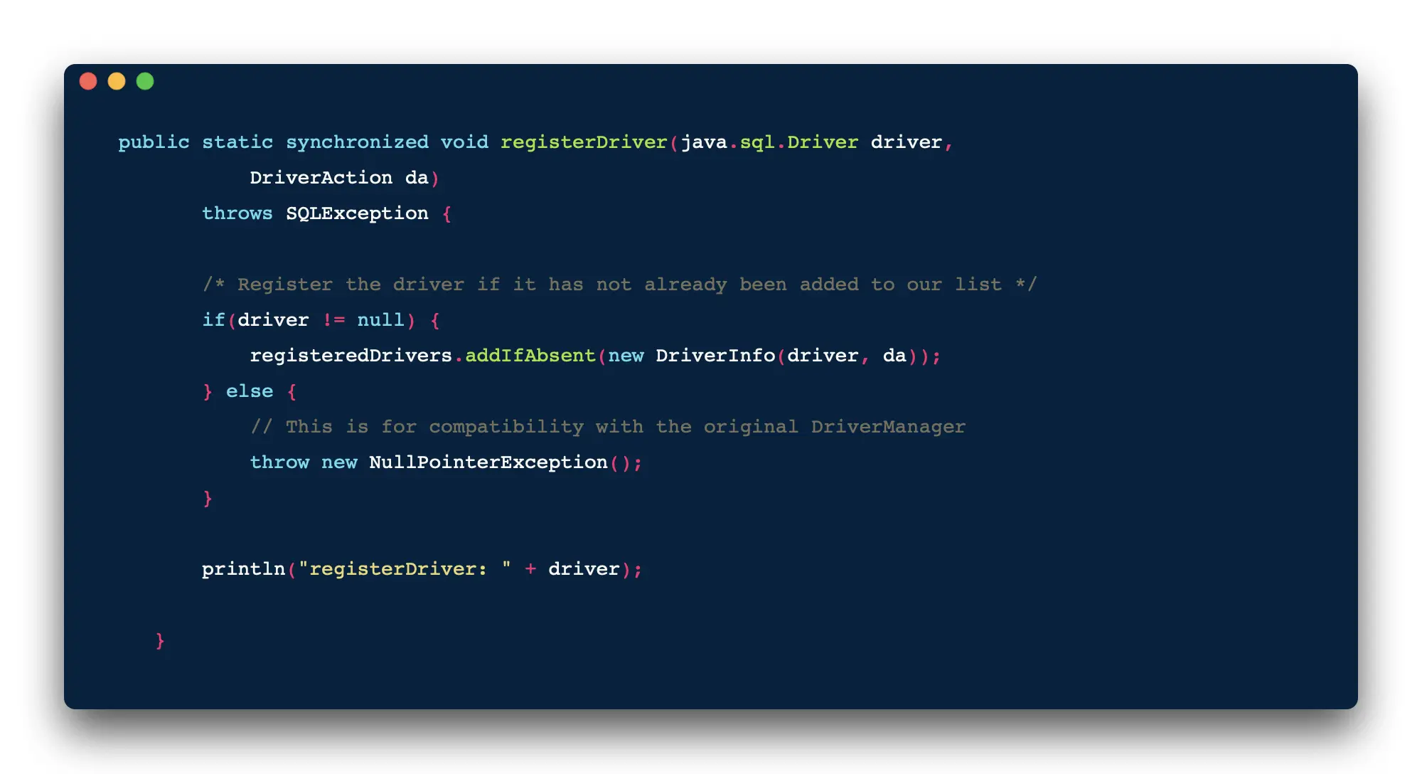 这里省略了大部分代码,可以看到我们使用数据库驱动前必须先要在DriverManager中使用registerDriver()注册,然后我们才能正常使用。