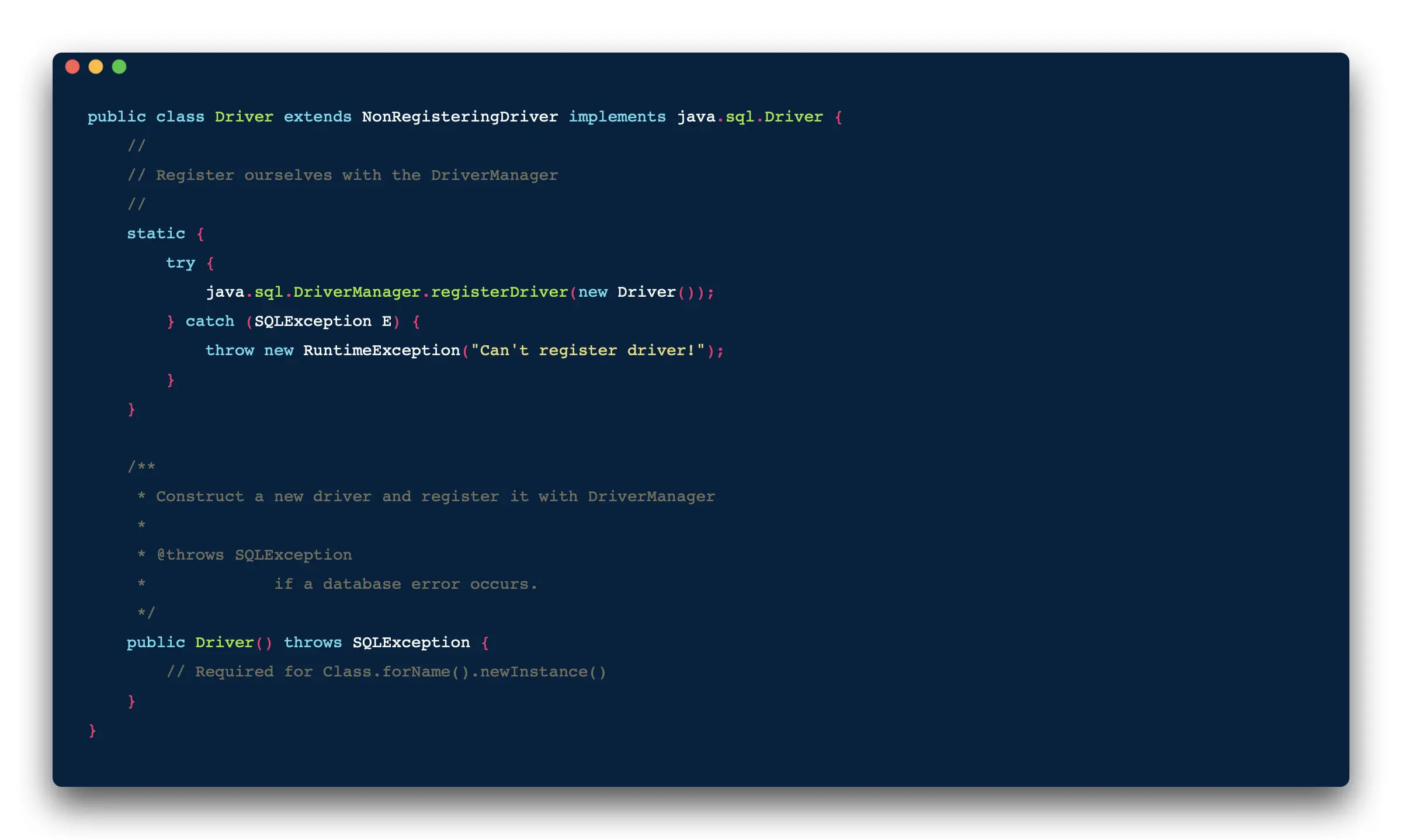 核心就是这句Class.forName()触发了mysql驱动的加载,我们看下mysql对Driver接口的实现: